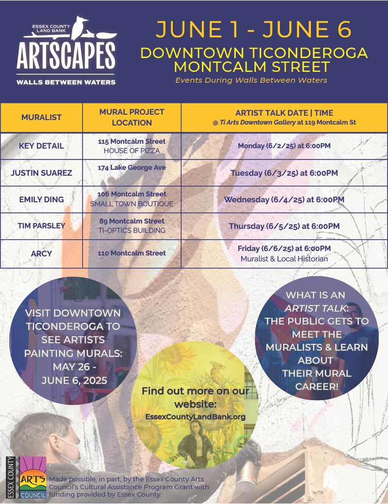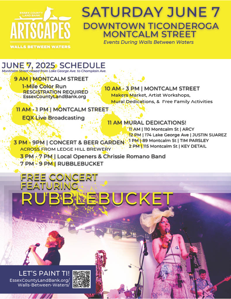 Ticonderoga, N.Y. – Essex County Land Bank, in partnership with the North Country Rural Development Coalition (NRDC), announce six world-renown muralists will paint large-scale murals in downtown Ticonderoga during the June 2025 Walls Between Waters mural festival! Muralists will begin work in late May, and all five murals will be completed by June 7th , 2025. The public is encouraged to visit Montcalm Street in Downtown Ticonderoga for the Walls Between Waters mural festival on Saturday, June 7th; Event highlights include a 1-mile color run (registration required), makers market, EQX live broadcasting, free activities for children, and a free concert on the lawn featuring Rubblebucket!