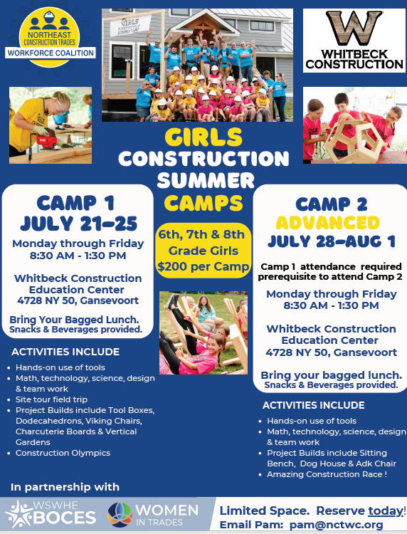 The Northeast Construction Trades Workforce Coalition (NCTWC) is thrilled to unveil its 2025 Girls Construction Summer Camps, taking place at the Whitbeck Construction Education Center in Gansevoort, NY. Designed for young women entering grades 6–8, these camps offer an empowering, hands-on dive into STEM through real-world construction projects.
